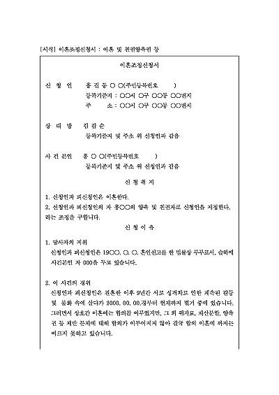 주요내용 : 감정적 소모를 줄이고 편결로는 득하기 어려운 재산분할, 위자료, 양육권, 양육비 등 여러 쟁점사항들을 법원의 중재를 통해 합리적으로 해결하고 소송보다 신속하고 원만하게 사건을 종결하기 위한 목적으로 사용되어지는 신청서 양식임. 단 무단전재 방지목적으로 PDF 파일로 올리니, 구매하신 후 혹 원본 파일이 필요하신 분들은 톡이나 문자, 메일, 전화 등을 주시면 작성방법 등에 대한 간단한 무료상담과 함께 원본 파일을 보내드리도록 하겠습니다.