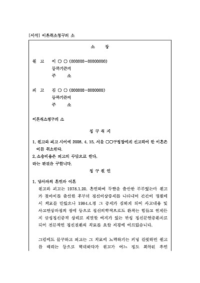 주요내용 : 기망이나 강박 등의 부동산 방법으로 이루어진 협의이혼을 무효로 만들어 처음부터 이이혼이 없었던 것처럼 되돌릴 목적으로 사용되어지는 소장 양식임. 단 무단전재 방지목적으로 PDF 파일로 올리니, 구매하신 후 혹 원본 파일이 필요하신 분들은 톡이나 문자, 메일, 전화 등을 주시면 작성방법 등에 대한 간단한 무료상담과 함께 원본 파일을 보내드리도록 하겠습니다.