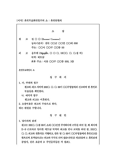 주요내용 : 혼인의사 합치가 없는 일방적 혼인신고의 경우 혼인 관계가 처음부터 존재하지 않았음을 법적으로 확인받기 위한 목적으로 사용되어지는 소장 양식임. 단 무단전재 방지목적으로 PDF 파일로 올리니구매하신 후 혹 원본 파일이 필요하신 분들은 톡이나 문자메일전화 등을 주시면 작성방법 등에 대한 간단한 무료상담과 함께 원본 파일을 보내드리도록 하겠습니다