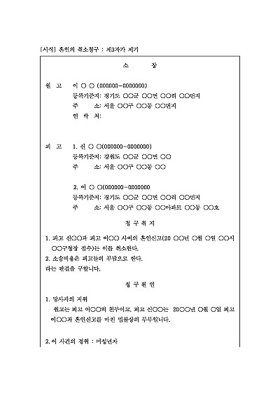 주요내용 : 혼인이 사기, 강박 등 그 성립에 중대한 하자가 있는 경우 그 혼인 관계를 법적으로 소급하여 무효화할 목적으로 사용되어지는 소장 양식임. 단 무단전재 방지목적으로 PDF 파일로 올리니구매하신 후 혹 원본 파일이 필요하신 분들은 톡이나 문자메일전화 등을 주시면 작성방법 등에 대한 간단한 무료상담과 함께 원본 파일을 보내드리도록 하겠습니다.