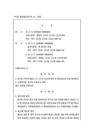 주요내용 : 혼인이 사기, 강박 등 그 성립에 중대한 하자가 있는 경우 그 혼인 관계를 법적으로 소급하여 무효화할 목적으로 사용되어지는 소장 양식임. 단 무단전재 방지목적으로 PDF 파일로 올리니구매하신 후 혹 원본 파일이 필요하신 분들은 톡이나 문자메일전화 등을 주시면 작성방법 등에 대한 간단한 무료상담과 함께 원본 파일을 보내드리도록 하겠습니다.