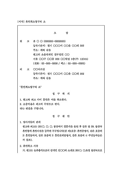 주요내용 : 혼인이 사기, 강박 등 그 성립에 중대한 하자가 있는 경우 그 혼인 관계를 법적으로 소급하여 무효화할 목적으로 사용되어지는 소장 양식임. 단 무단전재 방지목적으로 PDF 파일로 올리니구매하신 후 혹 원본 파일이 필요하신 분들은 톡이나 문자메일전화 등을 주시면 작성방법 등에 대한 간단한 무료상담과 함께 원본 파일을 보내드리도록 하겠습니다.