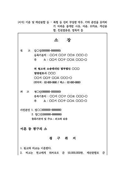 [로펌제작] 이혼 및 재산분할 등 – 폭행 등 심히 부당한 대우, 기타 혼인을 유지하기 어려운 중대한 사유, 이혼, 위자료, 재산분할, 친권양유권, 양육비 등 요약정보 및 구매