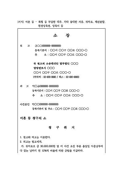 [로펌제작] 이혼 등 – 폭행 등 부당한 대우, 기타 중대한 사유, 위자료, 재산분할, 친권양육권, 양육비 등 요약정보 및 구매