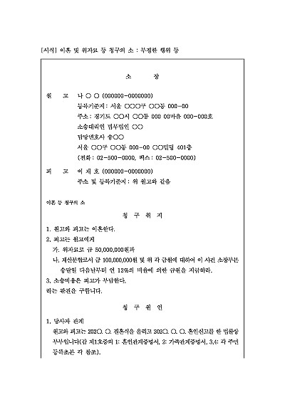 주요내용 : 부부관계를 법적으로 정리하기 위한 이혼소송 제기시 이혼과 함께 위자료, 친권 및 양육권, 양육비 등의 청구를 목적으로 사용되어지는 소장 양식임. 단 무단전재 방지목적으로 PDF 파일로 올리니, 구매하신 후 혹 원본 파일이 필요하신 분들은 톡이나 문자, 메일, 전화 등을 주시면 작성방법 등에 대한 간단한 무료상담과 함께 원본 파일을 보내드리도록 하겠습니다