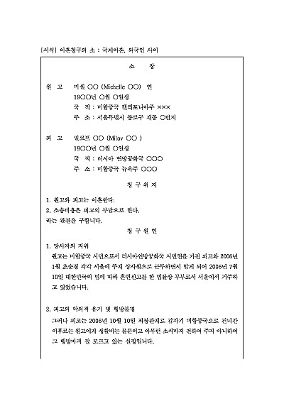 주요내용 : 국제결혼 후 상대방의 악의의, 가타 혼인을 유지하기 어려운 중대한 사유 등으로 이혼을 구하고자 할 때 사용되어지는 소장 양식임(공시송달 신청 포함). 단 무단전재 방지목적으로 PDF 파일로 올리니구매하신 후 혹 원본 파일이 필요하신 분들은 톡이나 문자메일전화 등을 주시면 작성방법 등에 대한 간단한 무료상담과 함께 원본 파일을 보내드리도록 하겠습니다.