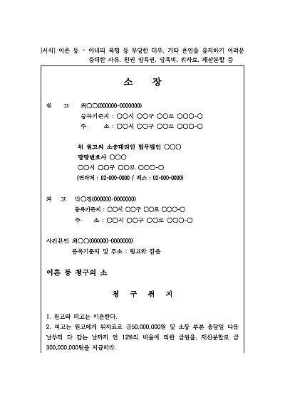 [로펌제작] 이혼 등 – 아내의 폭행 등 부당한 대우, 기타 혼인을 유지하기 어려운 중대한 사유, 친권 양육권, 양육비, 위자료, 재산분할 등 요약정보 및 구매