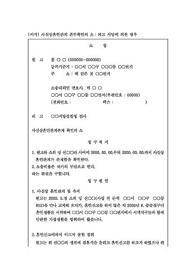 주요내용 : 혼인신고를 하지 않은 상태에서 당사자 일방이 사망하여 유족연금, 보험금 수령 등 법률상 배우자로서의 권리를 주장해야 하는 경우 등에 사용되어지는 소장 양식임. 단 무단전재 방지목적으로 PDF 파일로 올리니, 구매하신 후 혹 원본 파일이 필요하신 분들은 톡이나 문자, 메일, 전화 등을 주시면 작성방법 등에 대한 간단한 무료상담과 함께 원본 파일을 보내드리도록 하겠습니다.