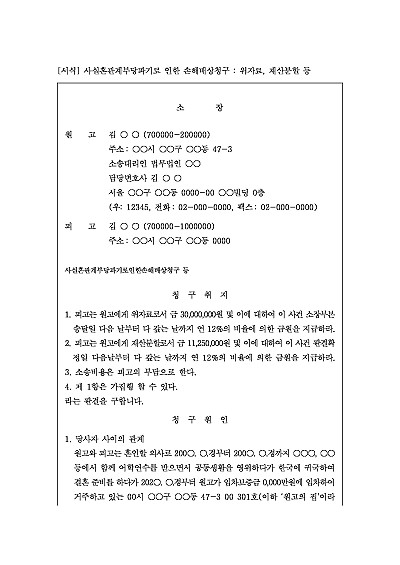 주요내용 : 사실혼이 정당한 사유없이 일방적인 파기나 상대방의 불륜행 등 귀책사유로 인한 경우 그로 인하여 발생한 정신적, 물질적 손해를 배상받고자 하는 목적으로 사용되어지는 소장 양식임. 단 무단전재 방지목적으로 PDF 파일로 올리니구매하신 후 혹 원본 파일이 필요하신 분들은 톡이나 문자메일전화 등을 주시면 작성방법 등에 대한 간단한 무료상담과 함께 원본 파일을 보내드리도록 하겠습니다.
