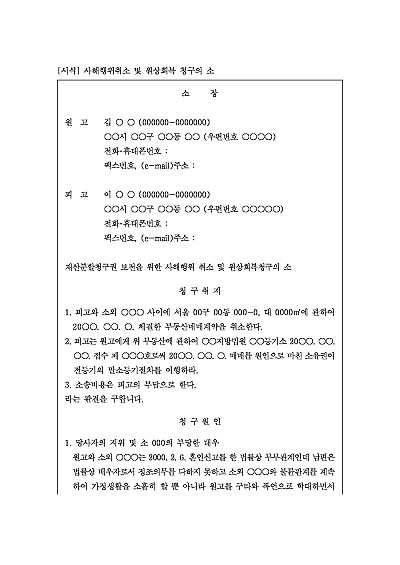 주요내용 : 상대방이 재산분할청구권을 면할 목적으로 재산을 은닉하거나 처분하는 행위를 취소하여, 그 재산을 원상태로 원상회복 시킴으로써 원고가 받을 수 있는 채권의 공동담보를 확보할 목적으로 사용되어지는 소장 양식임. 단 무단전재 방지목적으로 PDF 파일로 올리니구매하신 후 혹 원본 파일이 필요하신 분들은 톡이나 문자메일전화 등을 주시면 작성방법 등에 대한 간단한 무료상담과 함께 원본 파일을 보내드리도록 하겠습니다.