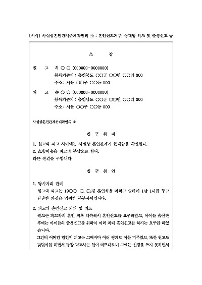 주요내용 : 법률혼은 아니지만 실질적으로부부와 같은 공동생활 즉, 사실혼관계를 영위하고 있음을 법원에서 확인받기 위한 목적으로 사용되어지는 소장 양식임(배우자로서의 법적 권리를 확보하기 위한 목적임). 단 무단전재 방지목적으로 PDF 파일로 올리니, 구매하신 후 혹 원본 파일이 필요하신 분들은 톡이나 문자, 메일, 전화 등을 주시면 작성방법 등에 대한 간단한 무료상담과 함께 원본 파일을 보내드리도록 하겠습니다.