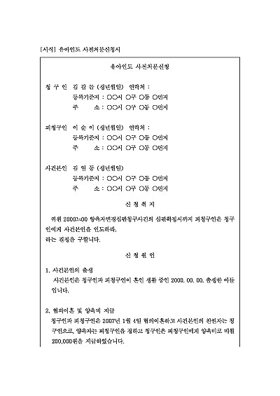 주요내용 : 이혼 소송 등 가사 사건이 확정되기 전이라도 자녀를 신속하게 인도받아야 할 필요가 있는 경우 법원의 임시결정을 구하고자 사용되어지는 신청서 양식임. 단 무단전재 방지목적으로 PDF 파일로 올리니구매하신 후 혹 원본 파일이 필요하신 분들은 톡이나 문자메일전화 등을 주시면 작성방법 등에 대한 간단한 무료상담과 함께 원본 파일을 보내드리도록 하겠습니다.