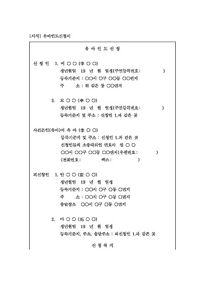 주요내용 : 상대방이 자녀를 돌려주지 않는 경우 아이의 안정적인 양육환경 확보를 목적으로 사용되어지는 신청서 양식임. 단 무단전재 방지목적으로 PDF 파일로 올리니, 구매하신 후 혹 원본 파일이 필요하신 분들은 톡이나 문자, 메일, 전화 등을 주시면 작성방법 등에 대한 간단한 무료상담과 함께 원본 파일을 보내드리도록 하겠습니다.