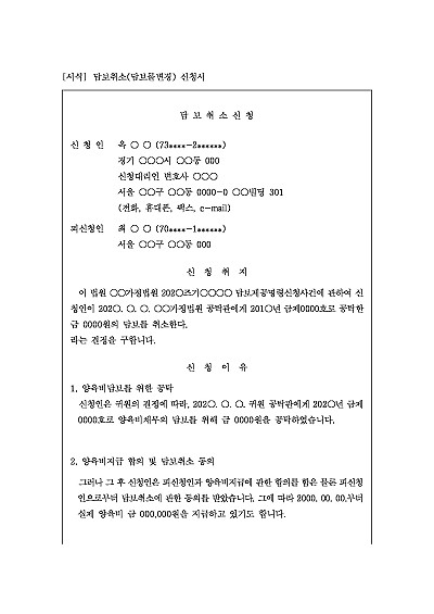 주요내용 : 담보제공명령에 따른 담보제공 후 그 담보의 사유가 소멸된 경우 기 제공한 담보를 반환받기 위한 목적으로 사용되어지는 신청서 양식임. 단 무단전재 방지목적으로 PDF 파일로 올리니, 구매하신 후 혹 원본 파일이 필요하신 분들은 톡이나 문자, 메일, 전화 등을 주시면 작성방법 등에 대한 간단한 무료상담과 함께 원본 파일을 보내드리도록 하겠습니다.