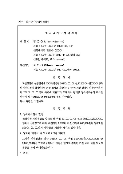 주요내용 : 양육비채무자가 담보제공명령을 받고도 기간 내 담보를 제공하지 아니할 경우 정기금 양육비 채권의 담보를 목적으로 양육비의 전부 또는 일부를 일시금으로 지급할 것을 구할 목적으로 사용되어지는 신청서 양식임. 단 무단전재 방지목적으로 PDF 파일로 올리니, 구매하신 후 혹 원본 파일이 필요하신 분들은 톡이나 문자, 메일, 전화 등을 주시면 작성방법 등에 대한 간단한 무료상담과 함께 원본 파일을 보내드리도록 하겠습니다.