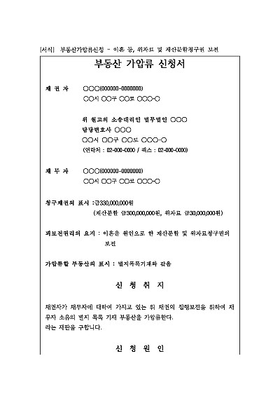 주요내용 : 소제기 전 배우자가 재산을 처분하거나은닉하는 것을 막아, 재산분할이나 위자료 등의 지급이 정상적으로 이루지도록 상대방의 책임재산을 보전하기 위한 목적으로 사용되어지는 신청서 양식임. 단 무단전재 방지목적으로 PDF 파일로 올리니, 구매하신 후 혹 원본 파일이 필요하신 분들은 톡이나 문자, 메일, 전화 등을 주시면 작성방법 등에 대한 간단한 무료상담과 함께 원본 파일을 보내드리도록 하겠습니다.