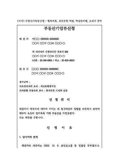 주요내용 : 채권자가 금전 채권을 보전하기 위해 소송 전이나 진행 중에 채무자 소유의 부동산(집, 땅 등) 처분(매매, 증여, 담보 설정 등)을 금지하기 위한 목적으로 사용되어지는 신청서 양식임. 단 무단전재 방지 목적으로 PDF 파일로 올리니, 구매하신 후 혹 원본 파일이 필요하신 분들은 톡이나 문자, 메일, 전화 등을 주시면 작성 방법 등에 대한 간단한 무료 상담과 함께 원본 파일을 보내드리도록 하겠습니다.