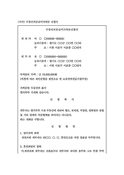 주요내용 : 이혼 재산분할 대상이 되는 부동산을 상대방이 제3자에게 매매, 증여 등 임의로 처분하는 것을 막아, 나중에 재산분할 판결대로 재산을 분할받지 못하게 되는 상황을 방지하기 위한 목적으로 사용되어지는 신청서 양식임. 단 무단전재 방지목적으로 PDF 파일로 올리니, 구매하신 후 혹 원본 파일이 필요하신 분들은 톡이나 문자, 메일, 전화 등을 주시면 작성방법 등에 대한 간단한 무료상담과 함께 원본 파일을 보내드리도록 하겠습니다.