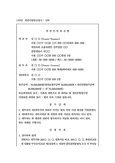 주요내용 : 소제기 전 배우자가 재산을 처분하거나은닉하는 것을 막아, 재산분할이나 위자료 등의 지급이 정상적으로 이루지도록 상대방의 책임재산을 보전하기 위한 목적으로 사용되어지는 신청서 양식임. 단 무단전재 방지목적으로 PDF 파일로 올리니구매하신 후 혹 원본 파일이 필요하신 분들은 톡이나 문자메일전화 등을 주시면 작성방법 등에 대한 간단한 무료상담과 함께 원본 파일을 보내드리도록 하겠습니다.