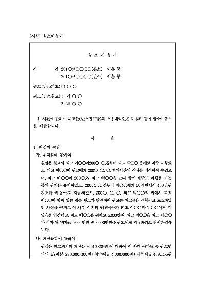 주요내용 :1심 판결에 불복하는 구체적인 이유를 상세히 밝혀 항소심 재판부가 쟁점을 파악하고 효율적인 심리를 진행하기 위한 목적으로 사용되어지는 양식임. 단 무단전재 방지목적으로 PDF 파일로 올리니, 구매하신 후 혹 원본 파일이 필요하신 분들은 톡이나 문자, 메일, 전화 등을 주시면 작성방법 등에 대한 간단한 무료상담과 함께 원본 파일을 보내드리도록 하겠습니다.
