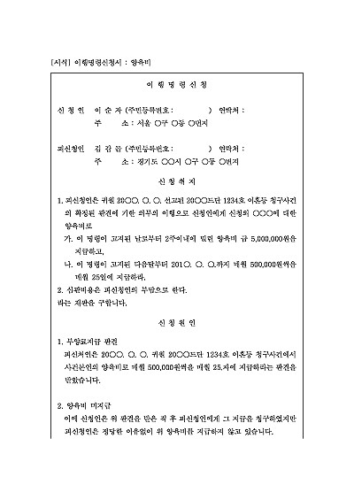 주요내용 : 법원이 정한 양육비 지급의무를 이행하지 않는 상대방에게 일정 기간 내에 양육비 지급의무 이행을 명령하고, 만약 명령을 위반할 경우 유치장 감치, 운전면허 정지, 출국 금지, 형사 처벌 등 더욱 강력한 제재를 가할 목적으로 사용되어지는 신청서 양식임. 단 무단전재 방지목적으로 PDF 파일로 올리니, 구매하신 후 혹 원본 파일이 필요하신 분들은 톡이나 문자, 메일, 전화 등을 주시면 작성방법 등에 대한 간단한 무료상담과 함께 원본 파일을 보내드리도록 하겠습니다.