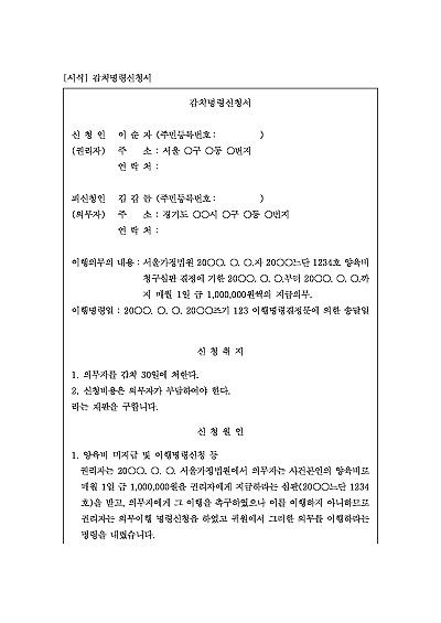 주요내용 : 양육비 지급 의무자가 법원의 이행명령을 받고 후 3회 이상 양육비를 지급하지 않았을 때에는 법원에 신청하여 상대방을 유치장에 유치하기 위한 목적으로 사용되어지는 신청서 양식임. 단 무단전재 방지목적으로 PDF 파일로 올리니, 구매하신 후 혹 원본 파일이 필요하신 분들은 톡이나 문자, 메일, 전화 등을 주시면 작성방법 등에 대한 간단한 무료상담과 함께 원본 파일을 보내드리도록 하겠습니다.