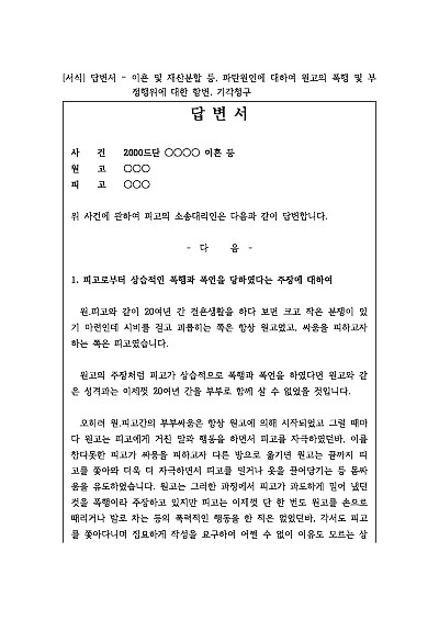 [로펌제작] 답변서 – 이혼 및 재산분할 등, 파탄원인에 대하여 원고의 폭행 및 부정행위에 대한 항변, 기각청구 요약정보 및 구매