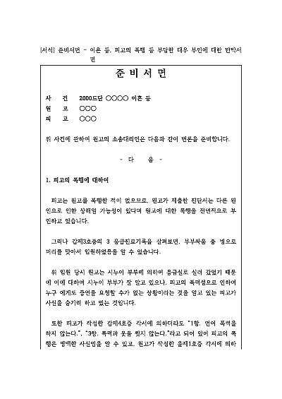 주요내용 : 당사자가 변론기일 전에 상대방의 주장(폭행 등 부당행위가 없었다는 항변 등)에 대하여 변론에서 진술하고자 하는 주장, 사실관계, 증거 등 법률적 내용을 미리 정리하여 법원에 제출하는 서면 양식임. 단 무단전재 방지 목적으로 PDF 파일로 올리니, 구매하신 후 혹 원본 파일이 필요하신 분들은 톡이나 문자, 메일, 전화 등을 주시면 작성 방법 등에 대한 간단한 무료 상담과 함께 원본 파일을 보내드리도록 하겠습니다.