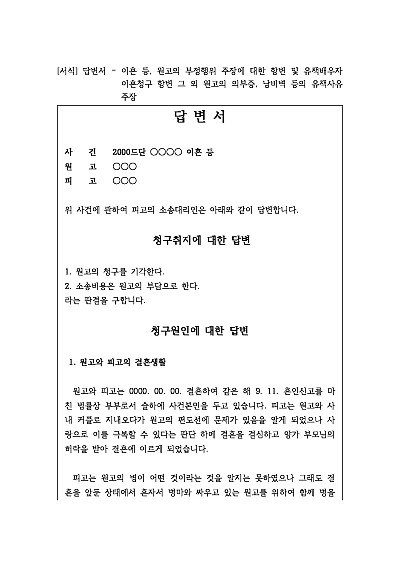 [로펌제작] 답변서 – 이혼 등, 원고의 부정행위 주장에 대한 항변 및 유책배우자 이혼청구 항변 그 외 원고의 의부증, 낭비벽 등의 유책사유 주장 요약정보 및 구매