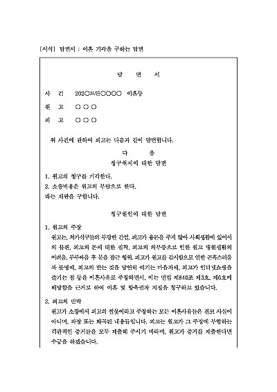 주요내용 : 소장 부본을 송달받은 날로부터 30일 이내에 법원에 제출해야 하며, 여기에는 원고의 청구에 대한 피고의 인정 여부 및 이에 대한 반박, 주장 사실과 증거 방법 등이 담기는데, 답변서를 제출하지 않으면 원고의 청구를 모두 인정한 것으로 간주되어 불리한 판결을 받을 수 있음. 단 무단전재 방지목적으로 PDF 파일로 올리니, 구매하신 후 혹 원본 파일이 필요하신 분들은 톡이나 문자, 메일, 전화 등을 주시면 작성방법 등에 대한 간단한 무료상담과 함께 원본 파일을 보내드리도록 하겠습니다.