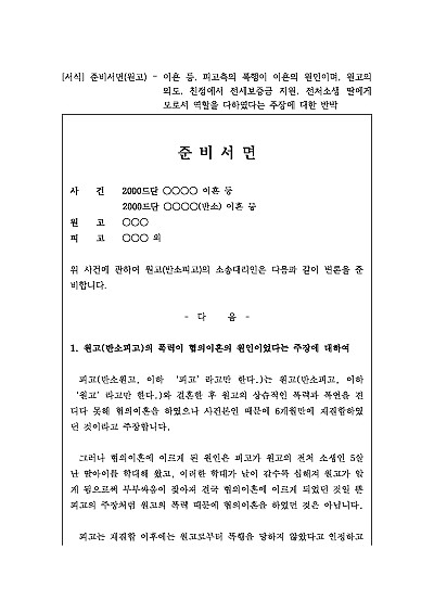 [로펌제작] 준비서면(원고) – 이혼 등, 피고측의 폭행이 이혼의 원인이며, 원고의 외도, 친정에서 전세보증금 지원, 전처소생 딸에게 모로서 역할을 다하였다는 주장에 대한 반박 요약정보 및 구매