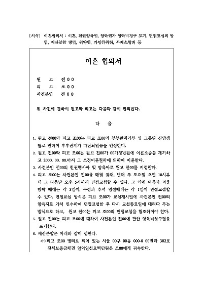 [로펌제작] 이혼합의서 : 이혼, 친권양육권, 양육권자 양육비청구 포기, 면접교섭의 방법, 재산분할 방법, 위약벌, 가압류취하, 부제소합의 등 요약정보 및 구매