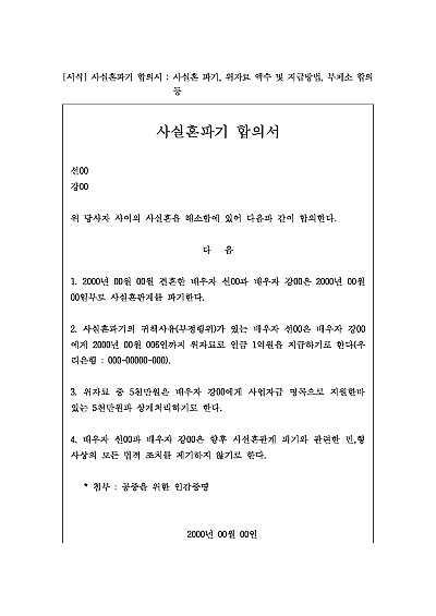 [로펌제작] 사실혼파기 합의서 : 사실혼 파기, 위자료 액수 및 지급방법, 부제소 합의 등 요약정보 및 구매