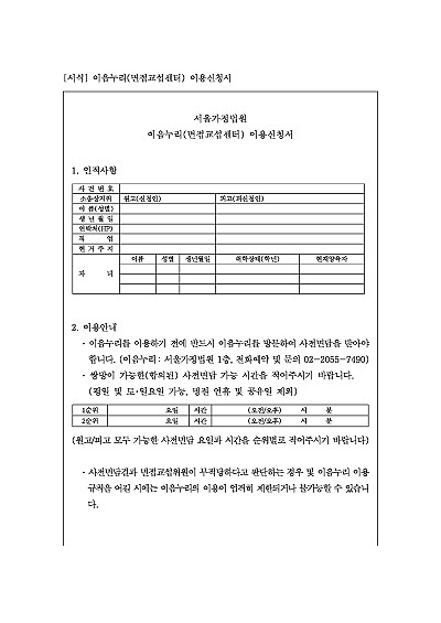 이음누리(면접교섭센터) 이용신청이란, 이혼 후 자녀를 양육하지 않는 부모와 자녀가 중립적이고 안전한 공간에서 만나 교류할 수 있도록 법원(또는 합의)의 허가를 받아 신청하는 절차이며, 이를 통해 이혼 가정의 자녀와 비양육 부모 간의 면접교섭을 지원하고, 안정적인 관계를 유지하도록 돕는 것을 목적으로 한다.