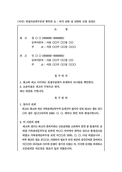 주요내용 : 주로 허위출생신고나 사실혼 관계의 자녀가 법적 관계가 없는 부모의 자녀로 등록된 경우 그 기록을 바로 잡아 진실한 혈연관계를 법적으로 확인할 목적으로 사용되어지는 소장 양식임. 단 무단전재 방지목적으로 PDF 파일로 올리니구매하신 후 혹 원본 파일이 필요하신 분들은 톡이나 문자메일전화 등을 주시면 작성방법 등에 대한 간단한 무료상담과 함께 원본 파일을 보내드리도록 하겠습니다.