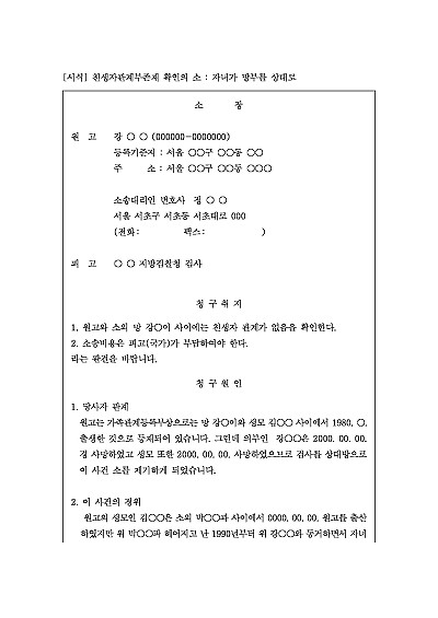 주요내용 : 주로 허위출생신고나 사실혼 관계의 자녀가 법적 관계가 없는 부모의 자녀로 등록된 경우 그 기록을 바로 잡아 진실한 혈연관계를 법적으로 확인할 목적으로 사용되어지는 소장 양식임. 단 무단전재 방지목적으로 PDF 파일로 올리니, 구매하신 후 혹 원본 파일이 필요하신 분들은 톡이나 문자, 메일, 전화 등을 주시면 작성방법 등에 대한 간단한 무료상담과 함께 원본 파일을 보내드리도록 하겠습니다.