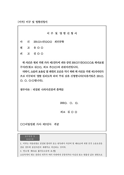 주요내용 : 관련 사건이 분산되어 있을 때 함께 처리하여소송의 효율성을 높이고 판결의 모순을 막기 위한 목적으로 사용되어지는 신청서 양식. 단 무단전재 방지목적으로 PDF 파일로 올리니, 구매하신 후 혹 원본 파일이 필요하신 분들은 톡이나 문자, 메일, 전화 등을 주시면 작성방법 등에 대한 간단한 무료상담과 함께 원본 파일을 보내드리도록 하겠습니다.