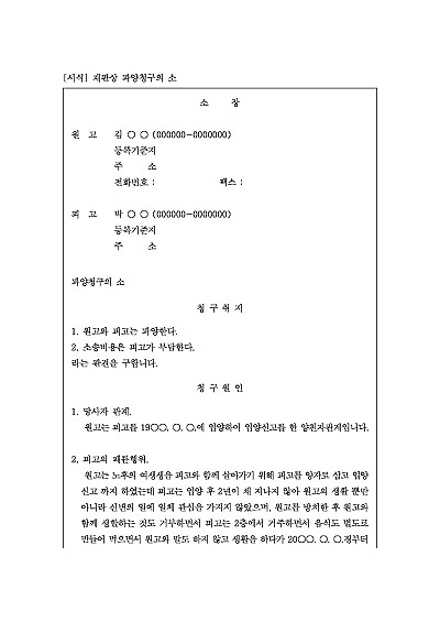 주요내용 : 양부모의 학대, 유기 등 양자의 복리를 현저히 해치는 행위, 양자가 양부모에게 심히 부당한 대우를 한 경우, 양부모나 양자의 생사가 3년 이상 불분명한 경우 양자관계를 해소할 목적으로 사용되어지는 소장 양식임. 단 무단전재 방지목적으로 PDF 파일로 올리니, 구매하신 후 혹 원본 파일이 필요하신 분들은 톡이나 문자, 메일, 전화 등을 주시면 작성방법 등에 대한 간단한 무료상담과 함께 원본 파일을 보내드리도록 하겠습니다.