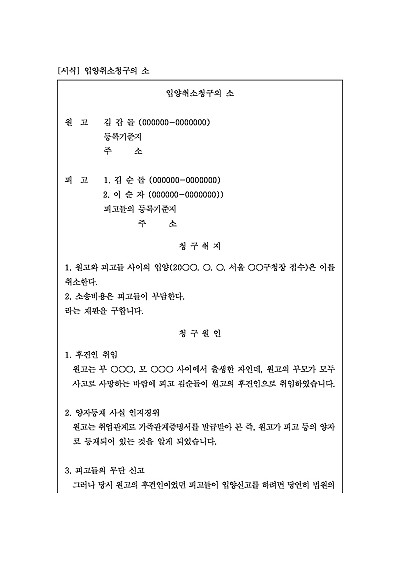 주요내용 양부모 또는 양자(혹은 그 법정대리인)가 법률이 정한 입양 취소 사유를 근거로 소를 제기할 목적으롤 사용되어지는 양식임단 무단전재 방지목적으로 PDF 파일로 올리니구매하신 후 혹 원본 파일이 필요하신 분들은 톡이나 문자메일전화 등을 주시면 작성방법 등에 대한 간단한 무료상담과 함께 원본 파일을 보내드리도록 하겠습니다.