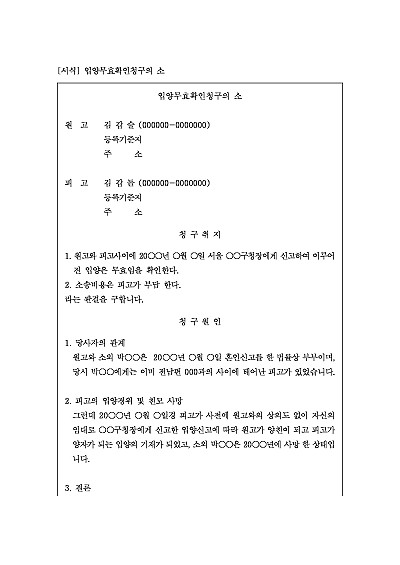 주요내용 : 입양에 흠결이 있어 처음부터 법률상 무효인 경우 그로 인해 입양의 효력이 없다는 것을 확인할 목적으로 사용되어지는 소장 양식임. 단 무단전재 방지목적으로 PDF 파일로 올리니, 구매하신 후 혹 원본 파일이 필요하신 분들은 톡이나 문자, 메일, 전화 등을 주시면 작성방법 등에 대한 간단한 무료상담과 함께 원본 파일을 보내드리도록 하겠습니다.