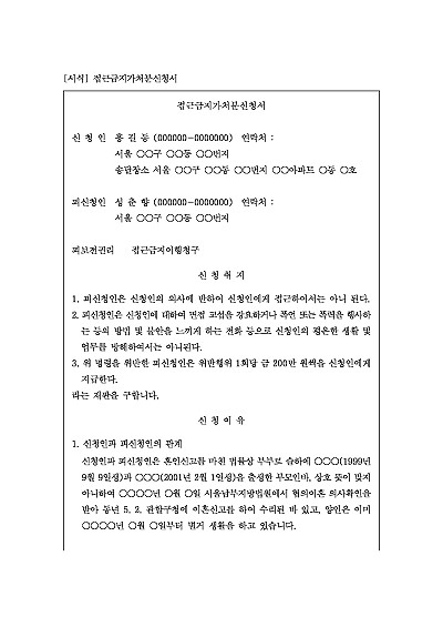 주요내용 : 이혼소송 전후 상대방의 지속적인 위협 행위로부터 피해자의 신변 등을 목기하기 위해 상대방의 접근이나 전화 등을 법적으로 차단시키기 위한 목적으로 사용되어지는 신청서 양식임. 단 무단전재 방지목적으로 PDF 파일로 올리니, 구매하신 후 혹 원본 파일이 필요하신 분들은 톡이나 문자, 메일, 전화 등을 주시면 작성방법 등에 대한 간단한 무료상담과 함께 원본 파일을 보내드리도록 하겠습니다.