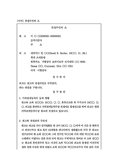 주요내용 : 혼인 중 자녀로 추정되는 자녀에 대해 부 또는 모가 친행관계를 부인하기 위한 목적으로 사용되어지는 소장 양식임. 단 무단전재 방지목적으로 PDF 파일로 올리니, 구매하신 후 혹 원본 파일이 필요하신 분들은 톡이나 문자, 메일, 전화 등을 주시면 작성방법 등에 대한 간단한 무료상담과 함께 원본 파일을 보내드리도록 하겠습니다.
