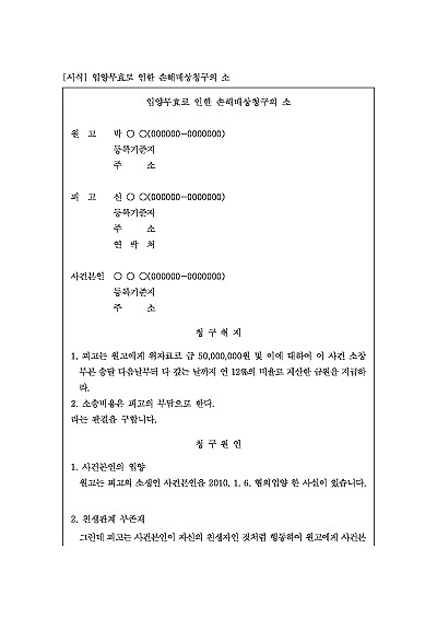 주요내용 : 입양무효로 인해 손해를 입은 경우 과실이 있는 상대방에게 재산상 및 정신적 손해에 대한 손해배상을 청구할 목적으로 사용되어지는 신청서 양식임. 단 무단전재 방지목적으로 PDF 파일로 올리니, 구매하신 후 혹 원본 파일이 필요하신 분들은 톡이나 문자, 메일, 전화 등을 주시면 작성방법 등에 대한 간단한 무료상담과 함께 원본 파일을 보내드리도록 하겠습니다.