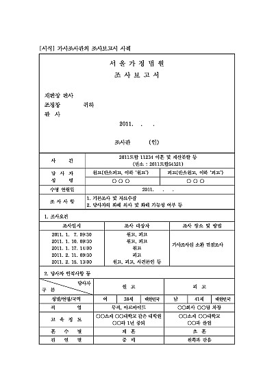 주요내용 가사조사는 법원이 이혼 소송 등의 가사사건에서 사실관계를 명확히 파악하기 위해 가사조사관이 당사자들의 가정 환경, 자녀 양육, 재산 상황 등을 조사하는 절차를 말하며, 본 양식은 실제 사례를 바탕으로 작성되어진 보고서 양식임.
