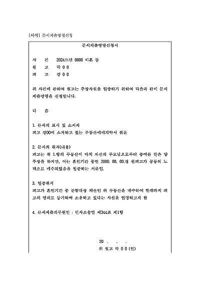 주요내용 : 상대방이나 제3자가 보유한 문서를 증거로 확보하여 재판에 활용하기 위한 목적으로 사용되어지는 신청서 양식임. 단 무단전재 방지목적으로 PDF 파일로 올리니구매하신 후 혹 원본 파일이 필요하신 분들은 톡이나 문자메일전화 등을 주시면 작성방법 등에 대한 간단한 무료상담과 함께 원본 파일을 보내드리도록 하겠습니다.