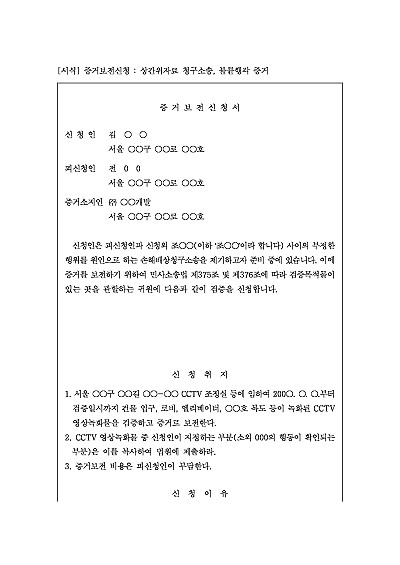 주요내용 : 이는 특히 짧은 보관 기간을 가진 CCTV 영상이나 금융 기록 등 시간이 지남에 따라 사라지기 쉬운 증거를 보호하고, 본안소송에서 이를 활용하여 소송의 유리한 진행을 이끌어내기 위한 목적으로 사용되어지는 신청서 양식임. 단 무단전재 방지목적으로 PDF 파일로 올리니, 구매하신 후 혹 원본 파일이 필요하신 분들은 톡이나 문자, 메일, 전화 등을 주시면 작성방법 등에 대한 간단한 무료상담과 함께 원본 파일을 보내드리도록 하겠습니다.