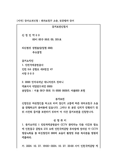 주요내용  이는 특히 짧은 보관 기간을 가진 CCTV 영상이나 금융 기록 등 시간이 지남에 따라 사라지기 쉬운 증거를 보호하고, 본안소송에서 이를 활용하여 소송의 유리한 진행을 이끌어내기 위한 목적으로 사용되어지는 신청서 양식임단 무단전재 방지목적으로 PDF 파일로 올리니구매하신 후 혹 원본 파일이 필요하신 분들은 톡이나 문자메일전화 등을 주시면 작성방법 등에 대한 간단한 무료상담과 함께 원본 파일을 보내드리도록 하겠습니다.