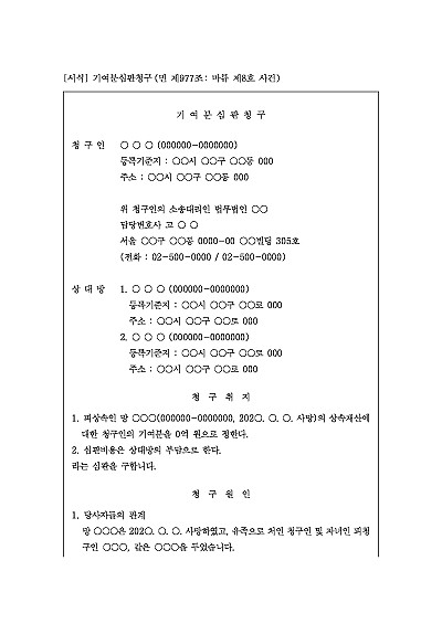 주요내용 공동상속인 중 피상속인의 재산을 유지·증가시키거나, 특별한 부양을 한 사람에게 그 기여한 만큼의 재산을 상속분에 가산하여 줄 것을 청구할 목적으로 사용되어지는 청구서 양식임단 무단전재 방지목적으로 PDF 파일로 올리니구매하신 후 혹 원본 파일이 필요하신 분들은 톡이나 문자메일전화 등을 주시면 작성방법 등에 대한 간단한 무료상담과 함께 원본 파일을 보내드리도록 하겠습니다.