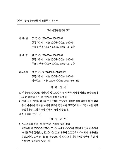 주요내용 : 상속인들 간에 상속재산 분할에 관한 협의가 이루어지지 아니할 때 법원에 상속재산분할을 구하는 목적으로 사용되어지는 소장 양식임. 단 무단전재 방지목적으로 PDF 파일로 올리니구매하신 후 혹 원본 파일이 필요하신 분들은 톡이나 문자메일전화 등을 주시면 작성방법 등에 대한 간단한 무료상담과 함께 원본 파일을 보내드리도록 하겠습니다.
