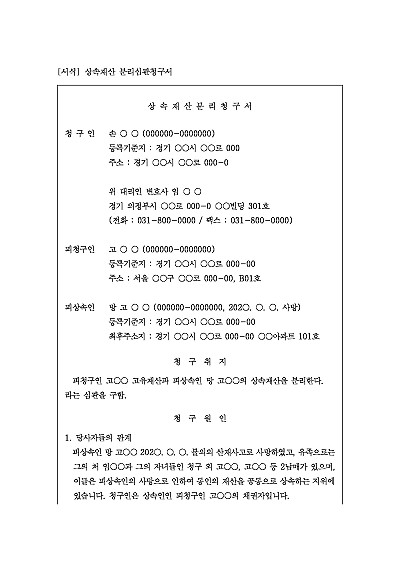 주요내용 : 상속재산보다 상속채무가 많은 상황에서 상속인의 채권자에게 불이익이 발생하는 것 등을 막기 위해 상속재산과 상속인의 고유재산을 법적으로 분리하기 위해 사용되어지는 청구서 양식임. 단 무단전재 방지목적으로 PDF 파일로 올리니, 구매하신 후 혹 원본 파일이 필요하신 분들은 톡이나 문자, 메일, 전화 등을 주시면 작성방법 등에 대한 간단한 무료상담과 함께 원본 파일을 보내드리도록 하겠습니다.